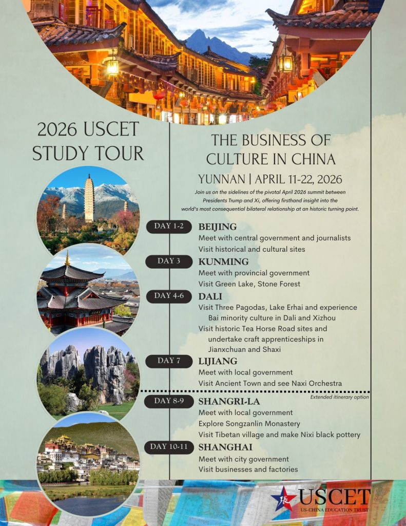 Join us April 11-22, 2026, for USCET’s inaugural China Study Tour on the sidelines of the pivotal April 2026 summit between Presidents Trump and Xi, offering firsthand insight into the world’s most consequential bilateral relationship at a historic turning point.