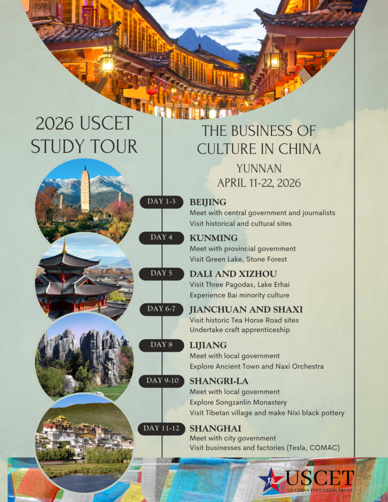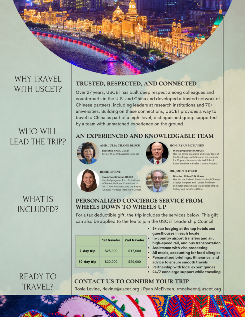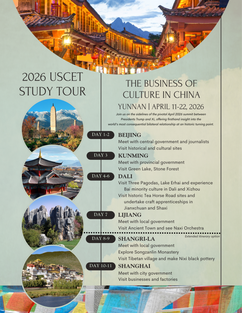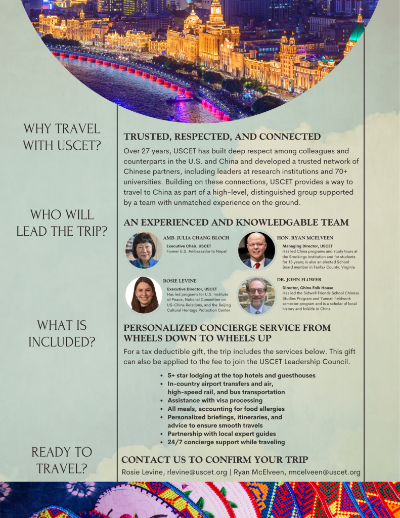 Join us April 11-22, 2026, for USCET’s inaugural China Study Tour on the sidelines of the pivotal April 2026 summit between Presidents Trump and Xi, offering firsthand insight into the world’s most consequential bilateral relationship at a historic turning point.