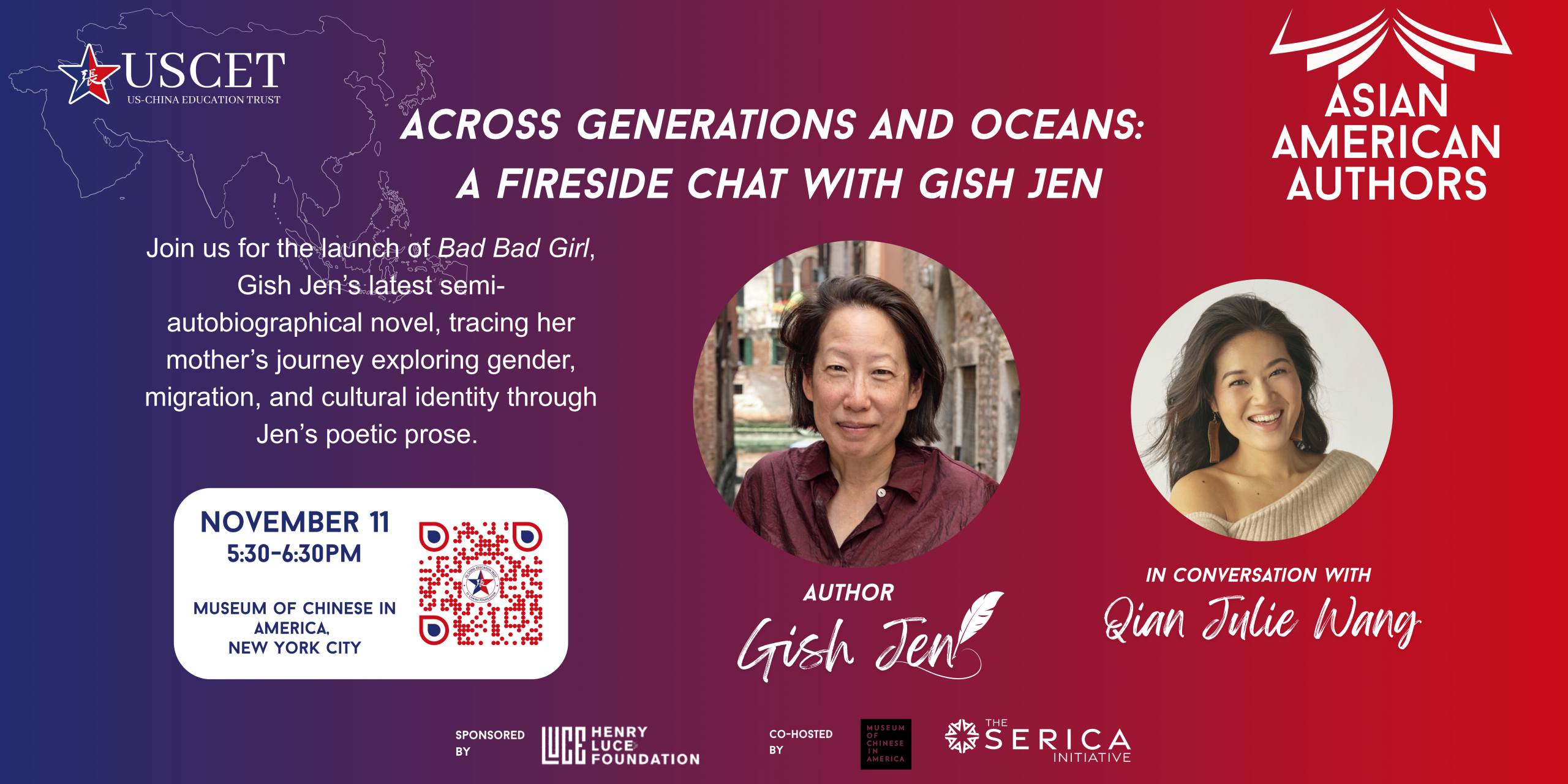 Please join us in-person from 5:30 – 6:30 PM ET at the Museum of Chinese in America (MOCA), located at 215 Centre Street, New York, NY. The event will feature a reading and a fireside chat with Gish Jen in conversation with Qian Julie Wang. A book signing will be held following the program.