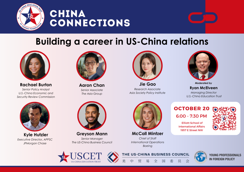 Curious about a career in the U.S.-China field? The U.S.-China Education Trust, the US-China Business Council, and the Young Professionals in Foreign Policy invite you to a panel discussion featuring early and mid-career professionals working on U.S.-China relations in the consulting, think tanks, corporate, non-profit, and government sectors, all drawing upon their China expertise. Panelists will share their experiences, offer practical advice on how to break into the field, and reflect on the skills that have helped them succeed. This event is a unique opportunity for upcoming professionals to hear about various career paths in the U.S.-China field and network with young professionals who share similar interests and passions.