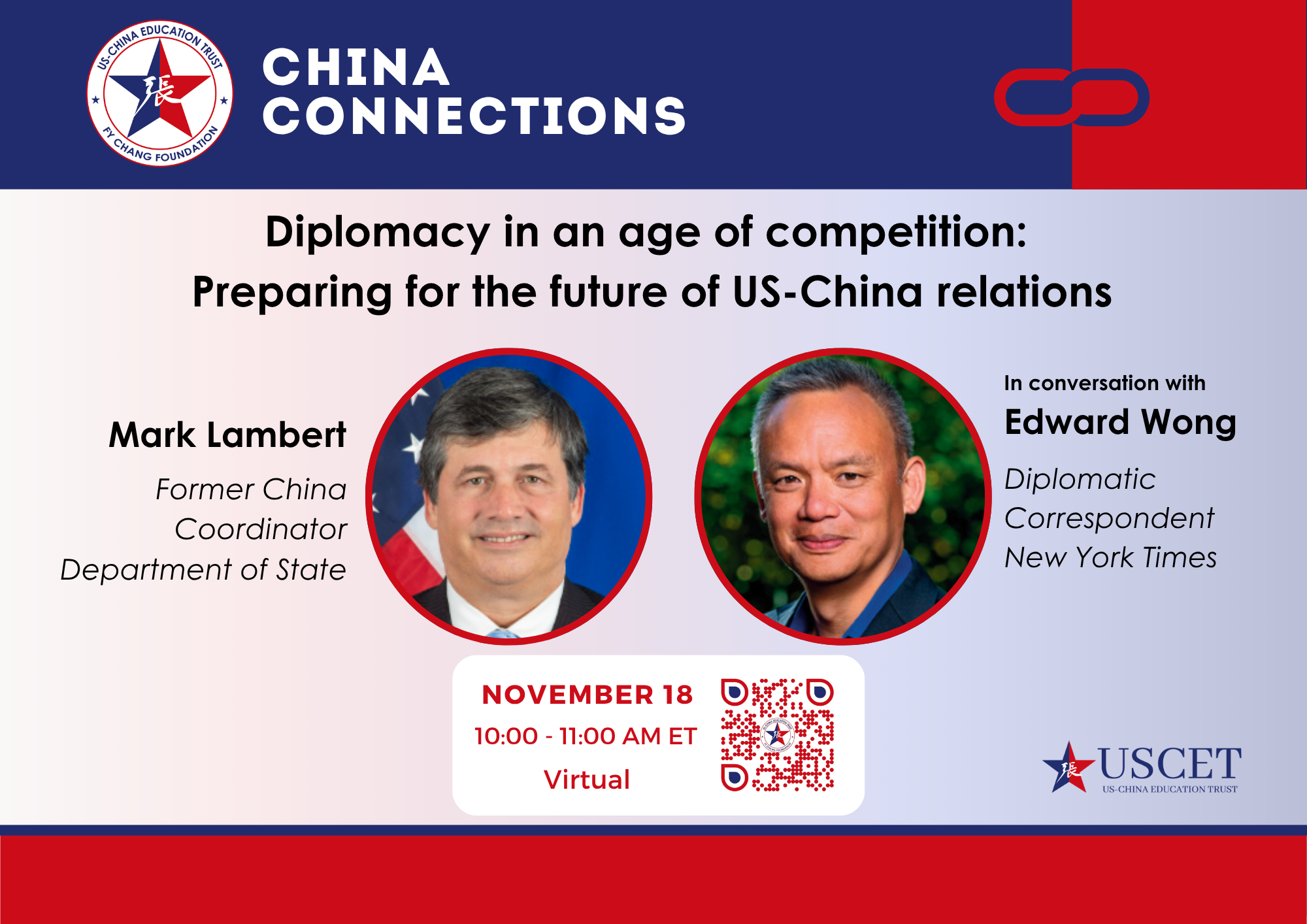 The US-China Education Trust invites you to a conversation between seasoned U.S. diplomat Mark B. Lambert and award-winning New York Times diplomatic correspondent Edward Wong. The discussion will focus on the future of U.S.-China relations and the role of diplomacy in U.S.-China ties. The speakers will also provide advice for students and rising experts considering a career in the China field.