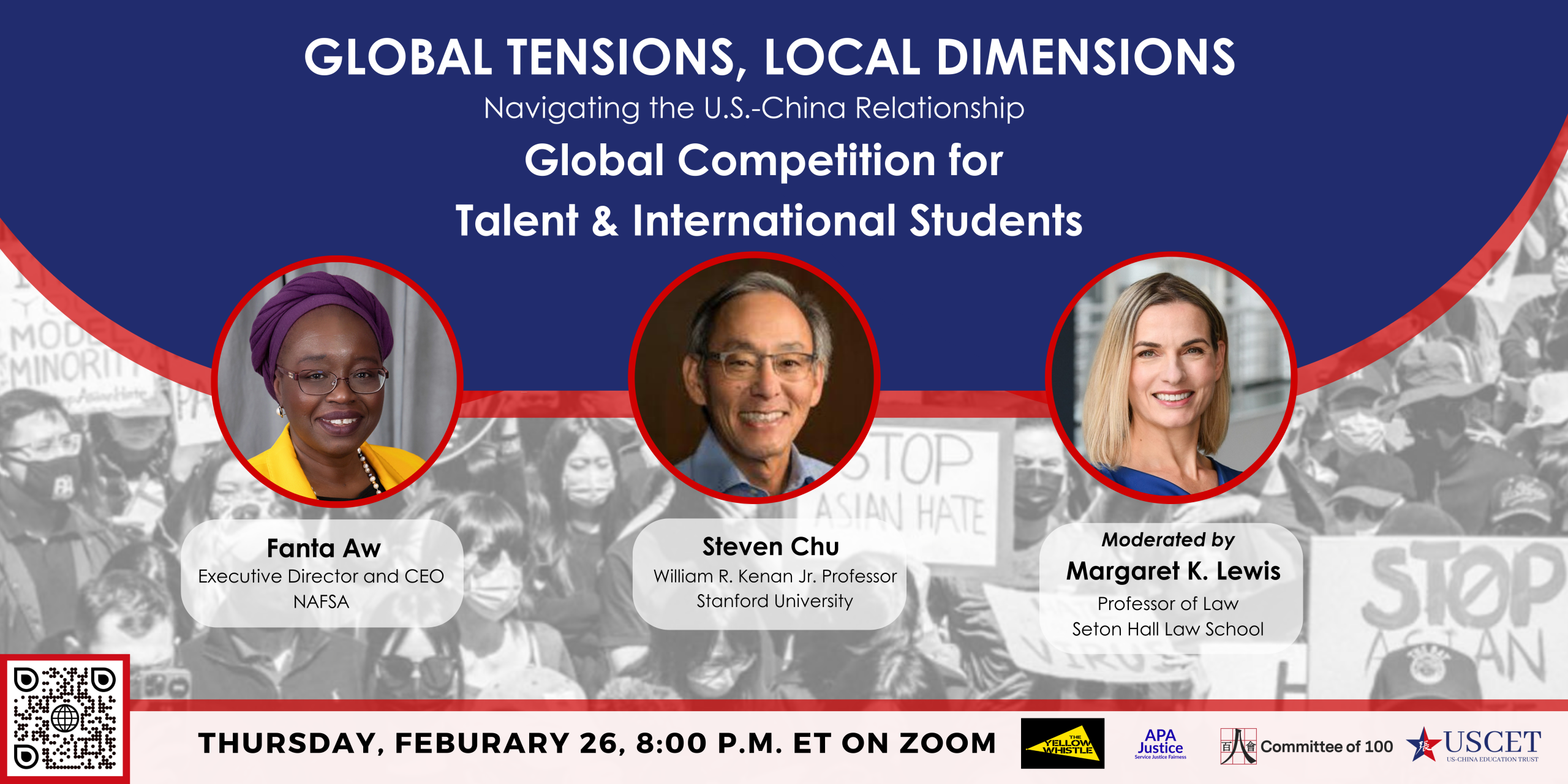 Join APA Justice, Committee of 100, and the US-China Education Trust on Feb 26, 8:00 – 9:00 PM ET for a discussion with leading experts on international education and U.S.-China relations, including Dr. Fanta Aw from NAFSA and Dr. Steven Chu from Stanford University, moderated by Maggie Lewis from Seton Hall University.